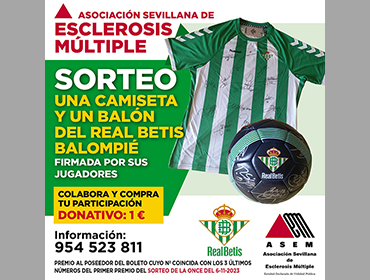 La Asociación Sevillana de Esclerosis Múltiple sortea una camiseta y un balón del Real Betis Balompié firmados por sus jugadores (¡con la firma de nuestro Capitán Joaquín!). Por tan sólo 1€ puedes participar. Cuantas más compres más posibilidades tendrás de ser el ganador.