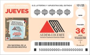 El décimo de Lotería Nacional del jueves 18 de diciembre estará dedicado al Día Nacional de la Esclerosis Múltiple e incluirá el anagrama de la Asociación Española de Esclerosis Múltiple (AEDEM-COCEMFE). Un año más, agradecemos a Loterías y Apuestas este importante apoyo a nuestra entidad.