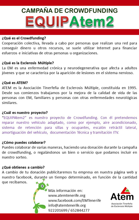 AEDEM-COCEMFE es una entidad sin ánimo de lucro que congrega a afectados de Esclerosis Múltiple, sus familiares y personas sensibilizadas con la problemática de esta enfermedad. Asimismo, cuenta con la colaboración de profesionales de la salud y otras disciplinas relacionadas con esta patología.