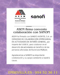 ASEM ha firmado con SANOFI AVENTIS, S.A. un Convenio de Colaboración Empresarial en Actividades de Interés General, por importe de 5.000 €, para colaborar en el desarrollo de actividades en beneficio de las personas afectadas de Esclerosis Múltiple.